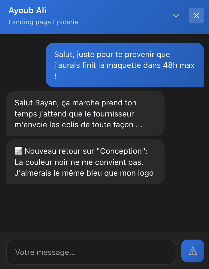 Le client suit l'avancement en temps réel dans une interface claire. Moins de messages, plus de travail.