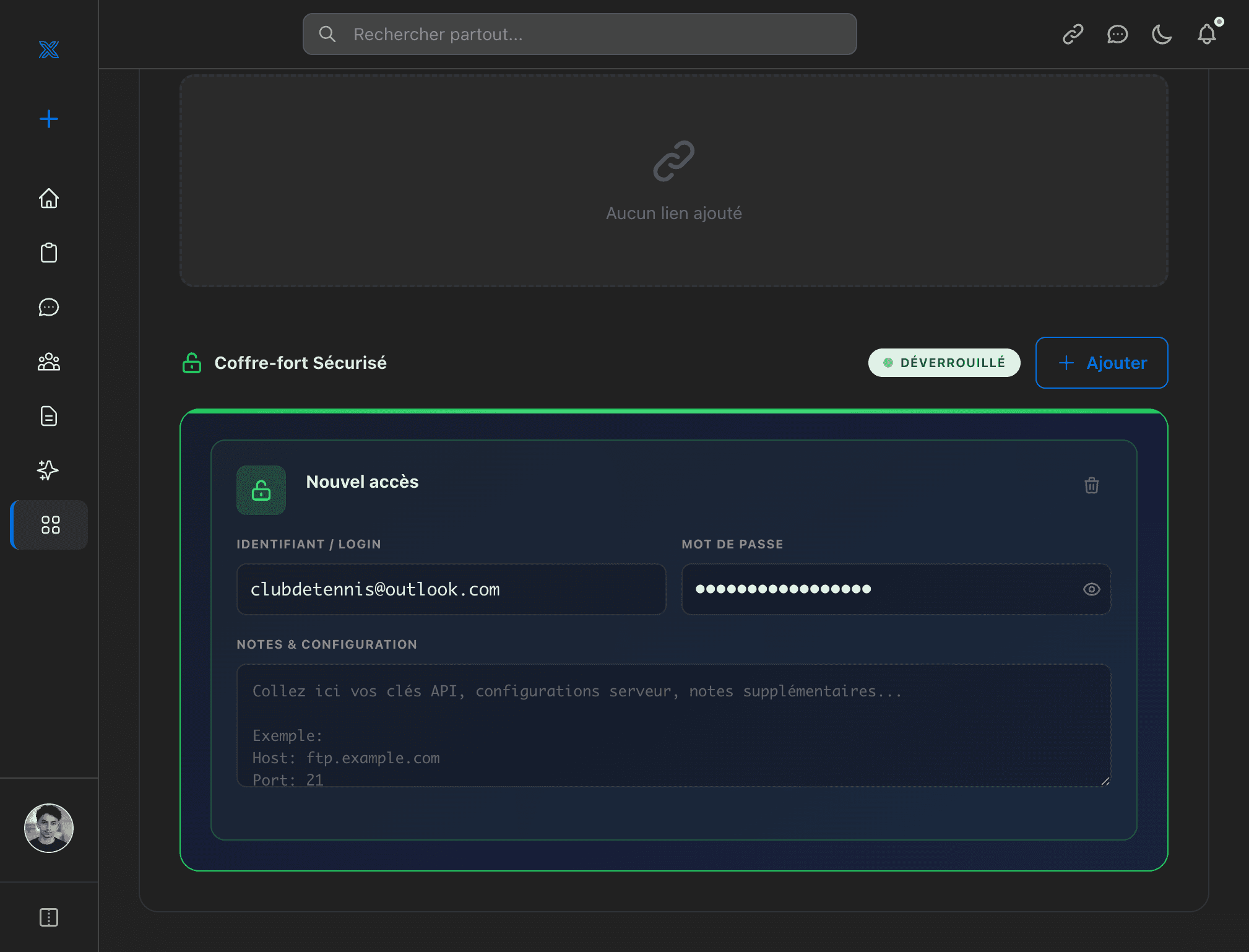 Un coffre-fort pour vos identifiants, API et accès serveurs. Chiffré, accessible uniquement par vous.