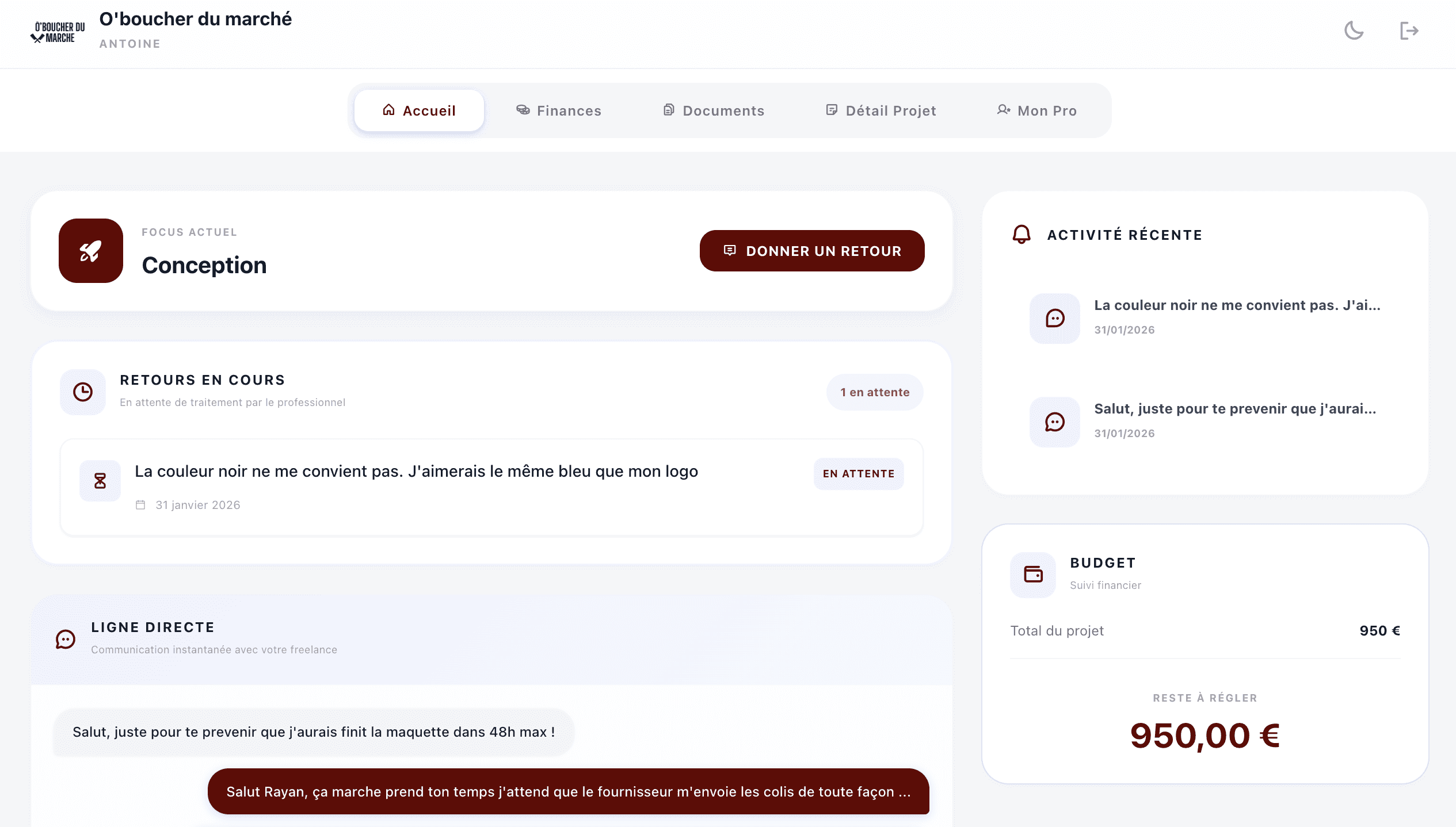 Une interface pour gérer vos projets, vos finances et vos clients sans jamais quitter votre tableau de bord.